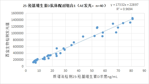 3.1.1 西寶生物發(fā)光(AE)平臺25-羥基維生素D抗體配對組合1與質譜法賦值的臨床樣本相關性R2>0.95,相關性良好;