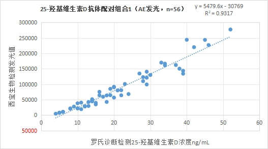 3.1.2西寶生物發(fā)光(AE)平臺25-羥基維生素D抗體配對組合1與羅氏診斷的25-羥基維生素D試劑(電化學發(fā)光法)賦值的臨床樣本相關性R2在0.90左右,相關性較好。