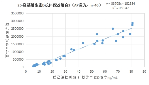3.2.1西寶生物發(fā)光(AP)平臺25-羥基維生素D抗體配對組合2與質譜法賦值的臨床樣本相關性R2在0.95左右,相關性良好;
