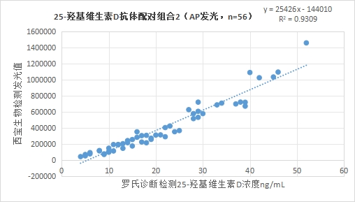 3.2.2西寶生物發(fā)光(AP)平臺25-羥基維生素D抗體配對組合2與羅氏診斷的25-羥基維生素D試劑(電化學發(fā)光法)賦值的臨床樣本相關性R2>0.90,相關性較好。