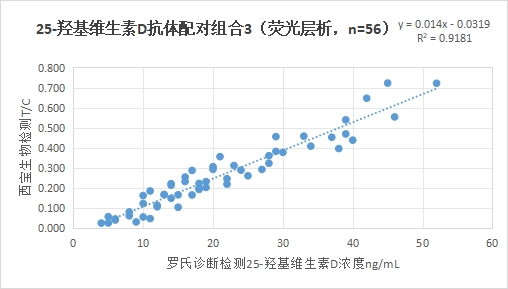 西寶生物熒光免疫層析平臺25-羥基維生素D抗體配對組合3與羅氏診斷25-羥基維生素D試劑(電化學發(fā)光法)賦值的臨床樣本相關性R2>0.90,相關性較好。