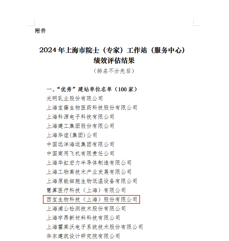 2024年11月,上海市院士專家工作站指導(dǎo)辦公室基于相關(guān)規(guī)定,對(duì)建站滿一年以上的院士(專家)工作站開展相關(guān)評(píng)估工作。經(jīng)審評(píng),西寶生物科技(上海)股份有限公司院士專家工作站獲評(píng)“優(yōu)秀”建站單位,喜獲“優(yōu)秀專家工作站”榮譽(yù)。
