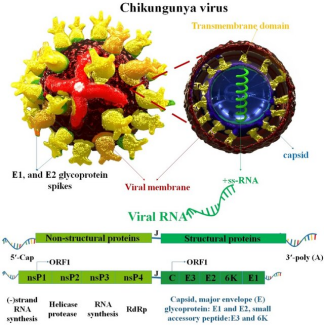 1952年在坦桑尼亞證實(shí)了基孔肯雅熱流行,并在1956年分離到病毒。該病毒是一種RNA病毒,屬于披膜病毒科甲病毒屬的Semliki forest(SF)抗原復(fù)合群。病毒直徑約70nm,有包膜,含有3個(gè)結(jié)構(gòu)蛋白(衣殼蛋白C、包膜蛋白E1和E2)和4個(gè)非結(jié)構(gòu)蛋白(nsP1、nsP2、nsP3和nsP4)。CHIKV的基因組為不分節(jié)段的正鏈RNA,長(zhǎng)度約為11~12 kb。
