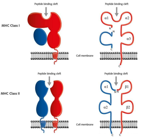 TCR-T療法依賴T細(xì)胞受體(TCR)與MHC呈遞的胞內(nèi)抗原結(jié)合識別腫瘤細(xì)胞。MHC有兩種類型MHC-I與MHC-II,由人類6號染色體短臂上的人類白細(xì)胞抗原(HLA)基因座編碼,在細(xì)胞表面不同程度表達(dá)。其中,HLA-A、HLA-B及HLA-C編碼MHC-I型分子,HLA-DR、HLA-DQ、HLA-DP編碼MHC-II型分子。MHC-I負(fù)責(zé)呈遞內(nèi)源性抗原信號分子,它在幾乎所有有核細(xì)胞表面表達(dá),由一條α鏈和β球蛋白組成,其中α1和α2兩個結(jié)構(gòu)域構(gòu)成一個溝(Groove),這是肽段結(jié)合區(qū),其允許抗原多肽片段結(jié)合并呈遞到細(xì)胞膜表面。MHC-II負(fù)責(zé)呈遞外源性信號分子,在抗原呈遞細(xì)胞(APC)表面表達(dá),如單核-巨噬細(xì)胞、樹突狀細(xì)胞及B細(xì)胞等。MHC-II由α和β兩條鏈組成,其中α1與β1之間形成的溝能參與抗原多肽片段的結(jié)合。