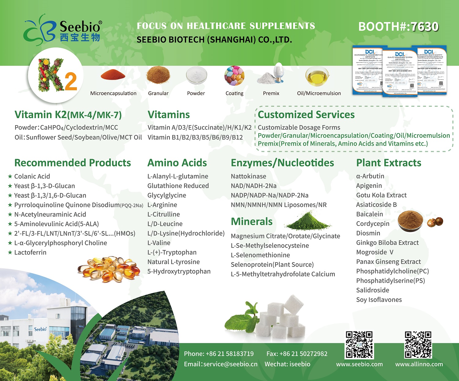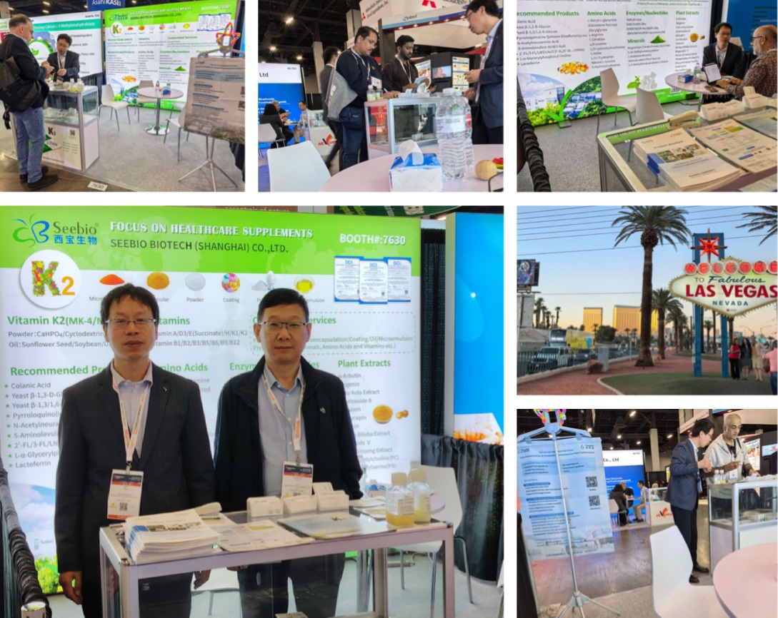 此外,西寶生物在展會上集中展示的多元明星產(chǎn)品矩陣,進一步凸顯了我們“全品類覆蓋”優(yōu)勢:維生素系列涵蓋維生素K2(MK4、MK7)、維生素 E(succinate)/K1、維生素 B12等;功能性成分包含花生四烯酸、膠原蛋白 (Ⅰ 型至 Ⅳ 型)、乳鐵蛋白、甘油糖苷等;天然提取物涉及甜菊糖苷、羅漢果苷、紅景天苷、牛至提取物、白柳樹皮提取物等;還包括硫酸葡聚糖(DSS)、人乳寡糖(HMOs)、尿石素 A/B、有機硒(L-硒-甲基硒代半胱氨酸等)、角鯊烯/角鯊烷等細分領(lǐng)域核心原料。豐富的產(chǎn)品品類與過硬的技術(shù)品質(zhì),吸引了眾多國際采購商、研發(fā)機構(gòu)駐足交流,現(xiàn)場達成多項合作意向。