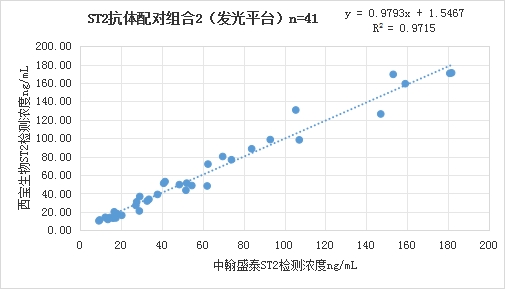 西寶生物發(fā)光平臺(tái)兩組ST2抗體配對(duì)分別與中翰盛泰ST2試劑(熒光免疫層析法)試劑賦值的臨床相關(guān)性R2>0.95,相關(guān)性良好。