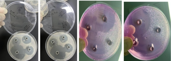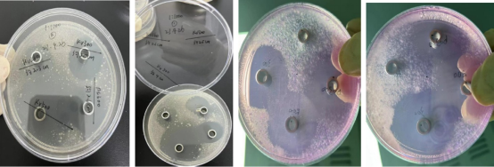 2、大豆酪蛋白板,KV500 的圈大,邊緣會有些菌帶,說明邊緣部分的抑制效果較弱。KV300 和PC300圈沒KV500 大,圈內(nèi)干凈無菌落,說明對接種液內(nèi)的細菌都有較好的抑制效果。