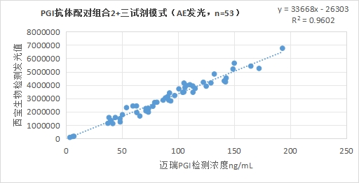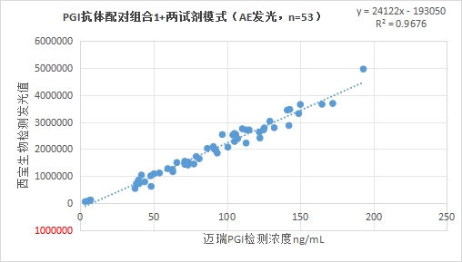西寶生物發(fā)光(AE)平臺PGI抗體配對組合2(三試劑模式)與邁瑞醫(yī)療PGI試劑(化學發(fā)光法)賦值的臨床樣本相關(guān)性R2>0.95,相關(guān)性良好。