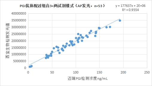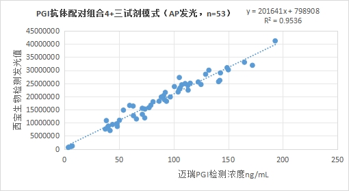 西寶生物發(fā)光(AP)平臺PGI抗體配對組合4(三試劑模式)與邁瑞醫(yī)療PGI試劑(化學發(fā)光法)賦值的臨床樣本相關(guān)性R2>0.95,相關(guān)性良好。