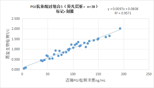 西寶生物熒光平臺PGI抗體配對組合5與邁瑞醫(yī)療PGI試劑(化學發(fā)光法)賦值的臨床樣本相關(guān)性R2>0.95,相關(guān)性良好。