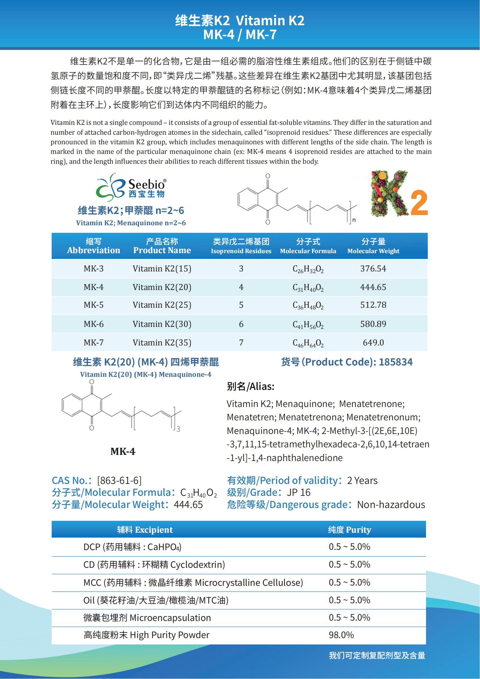 維生素K2不是單一的化合物,它是由一組必需的脂溶性維生素組成。他們的區(qū)別在于側(cè)鏈中碳?xì)湓拥臄?shù)量飽和度不同,即“類(lèi)異戊二烯”殘基。這些差異在維生素K2基團(tuán)中尤其明顯,該基團(tuán)包括側(cè)鏈長(zhǎng)度不同的甲萘醌。長(zhǎng)度以特定的甲萘醌鏈的名稱(chēng)標(biāo)記(例如:MK-4意味著4個(gè)類(lèi)異戊二烯基團(tuán)附著在主環(huán)上),長(zhǎng)度影響它們到達(dá)體內(nèi)不同組織的能力。