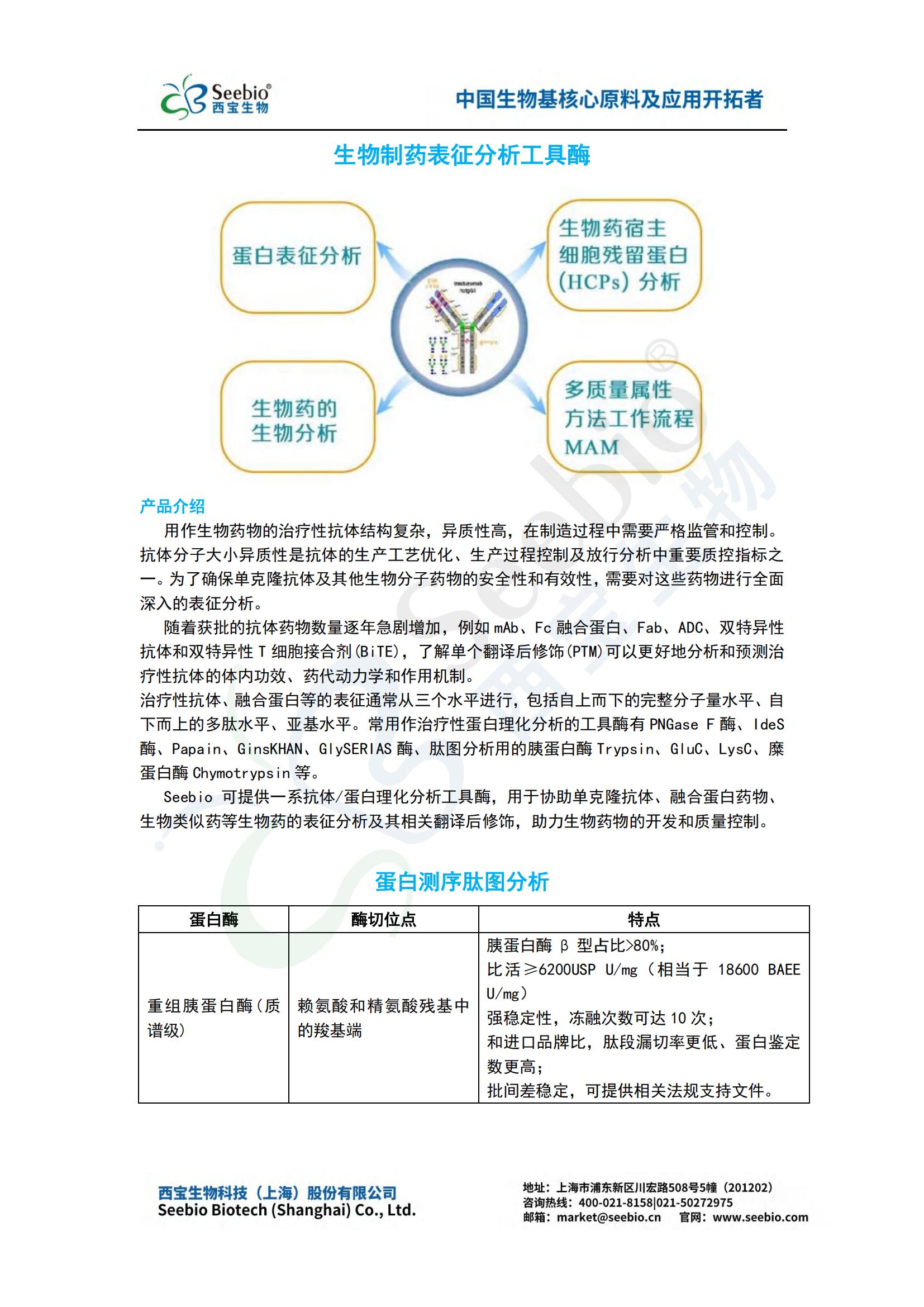 Seebio 可提供一系抗體/蛋白理化分析工具酶,用于協(xié)助單克隆抗體、融合蛋白藥物、生物類似藥等生物藥的表征分析及其相關(guān)翻譯后修飾,助力生物藥物的開(kāi)發(fā)和質(zhì)量控制。