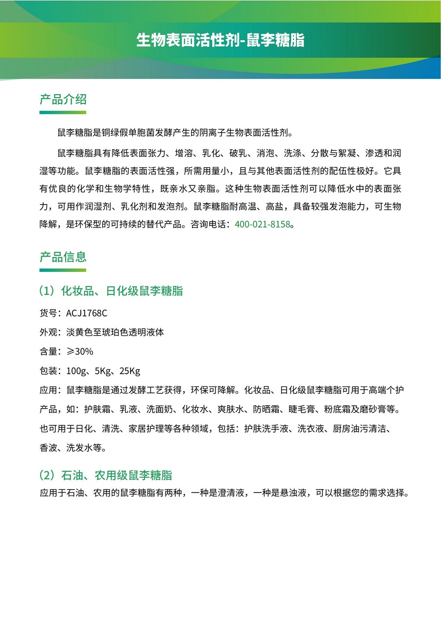 鼠李糖脂具有降低表面張力、增溶、乳化、破乳、消泡、洗滌、分散與絮凝、滲透和潤濕等功能。鼠李糖脂的表面活性強(qiáng),所需用量小,且與其他表面活性劑的配伍性極好。它具有優(yōu)良的化學(xué)和生物學(xué)特性,既親水又親脂。這種生物表面活性劑可以降低水中的表面張力,可用作潤濕劑、乳化劑和發(fā)泡劑。鼠李糖脂耐高溫、高鹽,具備較強(qiáng)發(fā)泡能力,可生物降解,是環(huán)保型的可持續(xù)的替代產(chǎn)品。咨詢電話:400-021-8158。