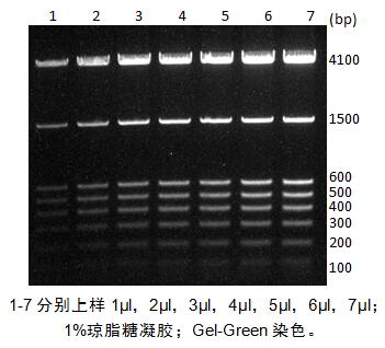 Seebio?100bp DNA Ladder 用于DNA電泳中的分子量標準參照,由100bp、200bp、300bp、400bp、500bp、600bp、1500bp、4100bp等共8條線形雙鏈DNA片段組成,保存于1×DNA Loading Buffer中。本品可直接用于瓊脂糖凝膠電泳,不建議用于聚丙烯酰胺凝膠電泳。
