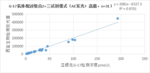 西寶生物發(fā)光(AE)平臺G-17抗體配對組合2(三試劑模式)與亞輝龍G-17試劑(化學(xué)發(fā)光法)賦值的臨床樣本相關(guān)性R<sup>2</sup>>0.95,相關(guān)性良好。