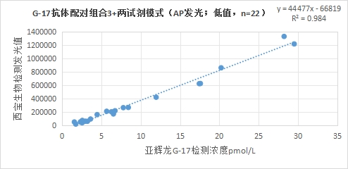 西寶生物熒光平臺G-17抗體配對組合5與亞輝龍G-17試劑(化學(xué)發(fā)光法)賦值的臨床樣本相關(guān)性R2>0.95,相關(guān)性良好;