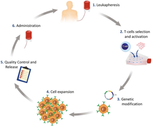 CAR-T細(xì)胞治療全流程,包括采集病患或者健康供體的外周血單核細(xì)胞(PBMC)、T細(xì)胞分離激活,T細(xì)胞體外基因修飾,CAR-T細(xì)胞體外擴(kuò)增,CAR-T細(xì)胞質(zhì)量監(jiān)控,CAR-T細(xì)胞回輸病患體內(nèi)這些主要步驟。