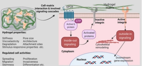聚乙二醇(PEG)基水凝膠作為可調(diào)控的三維網(wǎng)絡(luò)結(jié)構(gòu),通過其可變的理化性質(zhì)(如交聯(lián)方式)介導(dǎo)細(xì)胞與基質(zhì)的相互作用,提供動態(tài)微環(huán)境,而化學(xué)交聯(lián)(如共價鍵)增強(qiáng)機(jī)械穩(wěn)定性,從而觸發(fā)信號級聯(lián),調(diào)控細(xì)胞粘附、遷移及分化等行為。