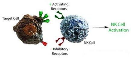 與T細(xì)胞的殺傷作用機(jī)制不同,NK細(xì)胞的殺傷活性受細(xì)胞表面的抑制性受體和激活性受體的共同調(diào)控,當(dāng)激活與抑制的平衡被打破,NK細(xì)胞便會行使相應(yīng)的功能。