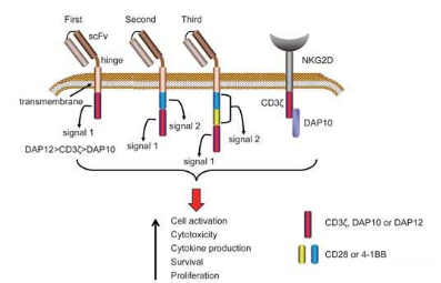 CAR-NK細(xì)胞的CAR結(jié)構(gòu)通常也由三部分組成,這與CAR-T細(xì)胞療法中使用的CAR結(jié)構(gòu)十分類似,事實上,目前的很多研究直接是把CAR-T中成熟的CAR結(jié)構(gòu)在NK細(xì)胞系中表達(dá)來制備CAR-NK。與CAR-T中常見的CAR結(jié)構(gòu)相比,CAR-NK還可以選擇NKG2D作為CAR結(jié)構(gòu)的識別結(jié)構(gòu)域,原因是腫瘤中普遍發(fā)生NKG2D的配體NKG2DL表達(dá)的上調(diào)。