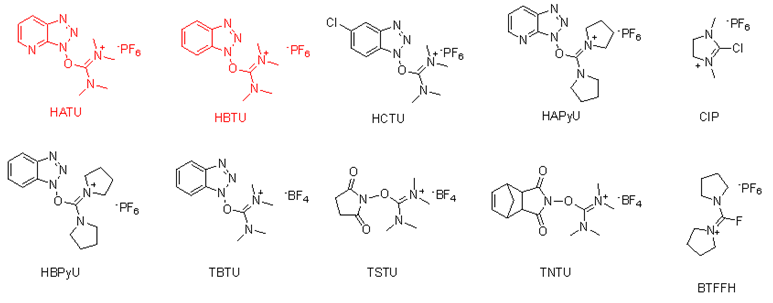 鎓鹽類的縮合劑活性較高,常用的脲鎓鹽如 HATU(縮合效果較好,但價格較貴),HBTU,和鏻鎓鹽如 PyBOP(活性高,一般在其他方法不反應(yīng)的條件下考慮),BOP。