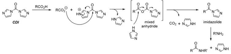 CDI被用作甲?;D(zhuǎn)移試劑和羧酸的活化,縮合分步進(jìn)行的,首先CDI與羧酸反應(yīng)得到高活性的?;溥?,然后胺極易與活性酯反應(yīng)得到相應(yīng)的?;a(chǎn)物,用量一定要嚴(yán)格控制在當(dāng)量為1(過量 CDI 和胺反應(yīng)產(chǎn)生脲的副產(chǎn)物)。