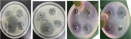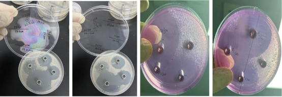 2、大豆酪蛋白板,KV500 的圈大,邊緣會有些菌帶,說明邊緣部分的抑制效果較弱。KV300 和PC300圈沒KV500 大,圈內(nèi)干凈無菌落,說明對接種液內(nèi)的細菌都有較好的抑制效果。