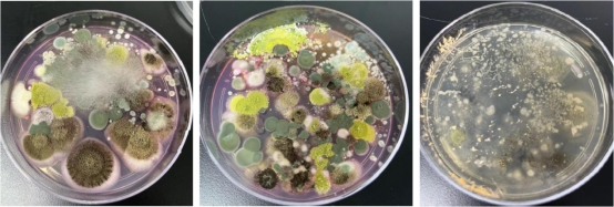 取西寶公司實驗室、生產(chǎn)車間、倉庫、過道的角落和設(shè)備處,用無菌棉球蘸取污物,接種到營養(yǎng)肉湯瓊脂平板、孟加拉紅瓊脂平板、馬鈴薯葡萄糖瓊脂平板,32℃培養(yǎng)長出菌落菌苔,挑取平板上易感代表性的菌落加入生理鹽水,制成混合菌接種液,接種液麥氏濁度1 左右。