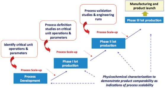 疫苗產(chǎn)品多樣且復(fù)雜,包括滅活或解毒疫苗;重組蛋白疫苗;腺病毒疫苗;及治療性疫苗等,圖1描述了原料藥疫苗工藝開發(fā)的通用方法。工藝開發(fā)從實(shí)驗(yàn)室規(guī)模開始,用于確定單元操作和參數(shù),然后逐步擴(kuò)大規(guī)模(通常在20L發(fā)酵或細(xì)胞培養(yǎng)下),用于生產(chǎn)用于I期臨床研究的GMP材料。在擴(kuò)展到200 L(通常用于第二階段)之前,使用實(shí)驗(yàn)設(shè)計(jì)(DoE)對(duì)關(guān)鍵單元操作和參數(shù)進(jìn)行過程定義研究。在第三階段(約2000L規(guī)模)之前,需要進(jìn)行工藝驗(yàn)證和工程運(yùn)行。在工藝開發(fā)和放大過程中,進(jìn)行生物物理和化學(xué)表征,以證明產(chǎn)品的可比性和工藝可擴(kuò)展性。