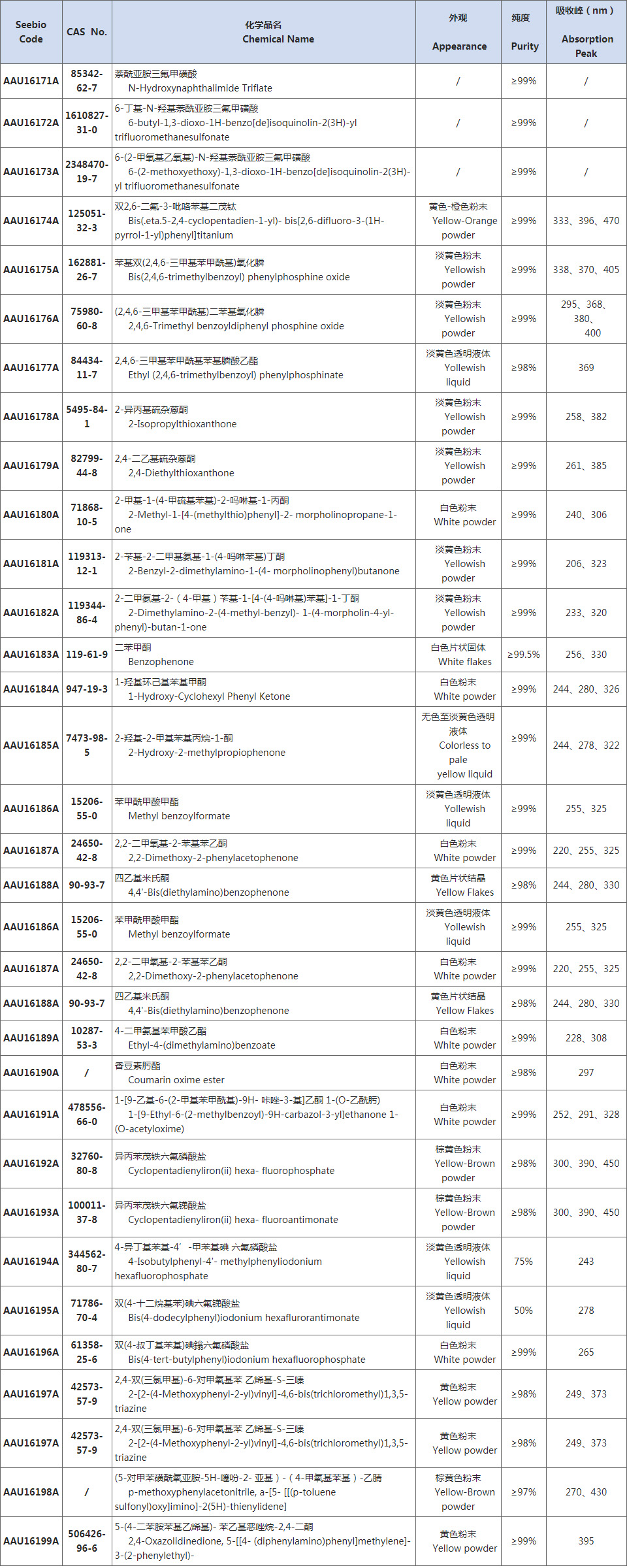 Seebio現(xiàn)貨供應(yīng)光引發(fā)劑(PI)/光敏劑(PAC)/光致產(chǎn)酸劑(PAG)產(chǎn)品