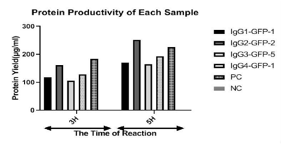 每個(gè)樣品的蛋白質(zhì)產(chǎn)量![]() | 在IgG系列的表達(dá)和純化試驗(yàn)中,檢測(cè) 了IgG1、IgG2、IgG3、IgG4和PC的產(chǎn)量分別是117.49,161.35,106.42,128.71和183.45μg/ml;它們?cè)?h的產(chǎn)量分別是170.50,251.77,164.64,192.56和225.54μg/ml。 |