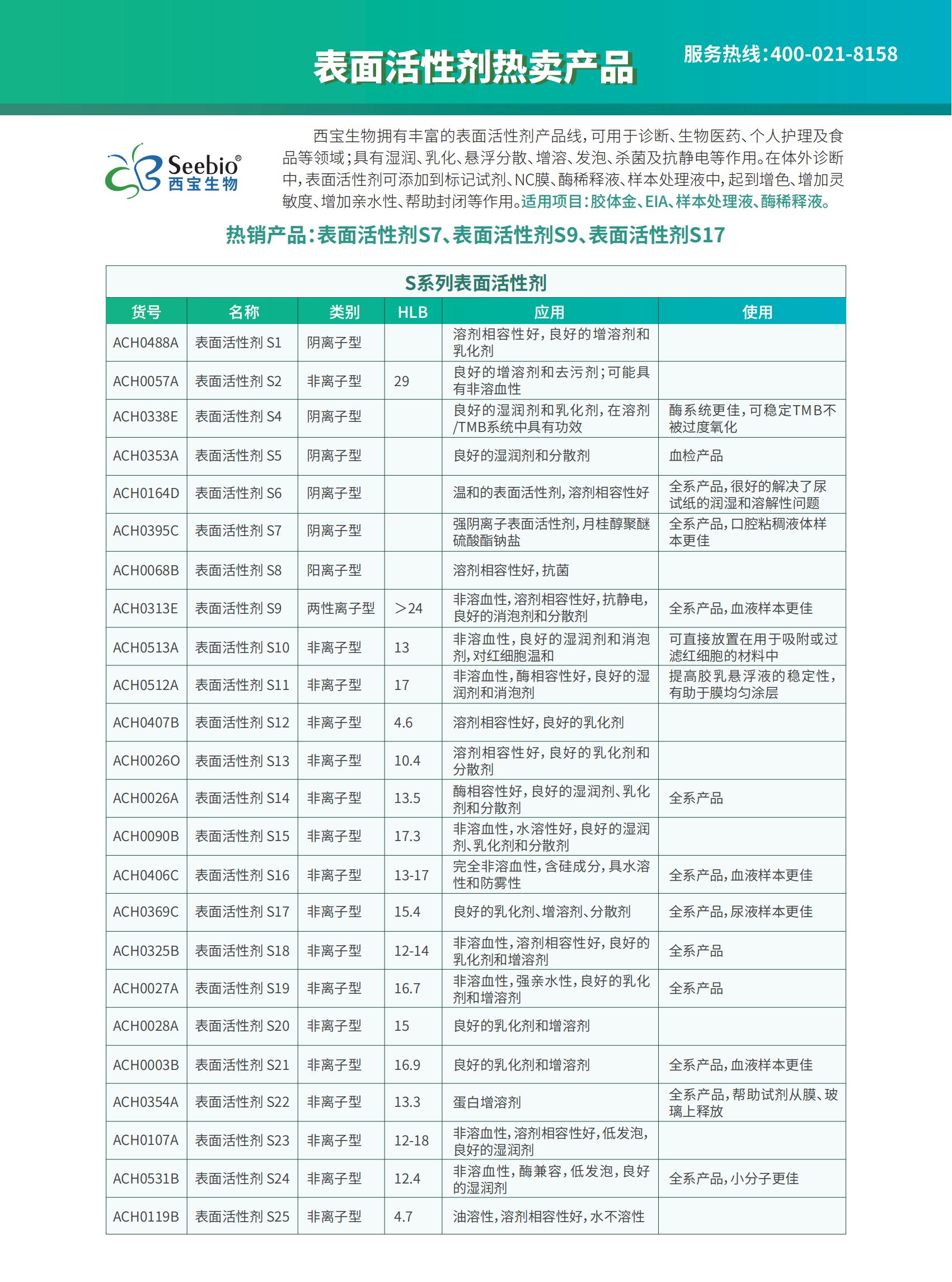 西寶生物擁有豐富的表面活性劑產(chǎn)品線(xiàn),可用于體外診斷、生物制藥、醫(yī)美日化等領(lǐng)域;具有濕潤(rùn)、乳化、懸浮分散、增溶、發(fā)泡、殺菌及抗靜電等作用。在體外診斷中, 表面活性劑可添加到標(biāo)記試劑、NC膜、酶稀釋液、樣本處理液中,起到增色、增加靈敏度、增加親水性、幫助封閉等作用。適用項(xiàng)目:膠體金、EIA、樣本處理液、酶稀釋液。