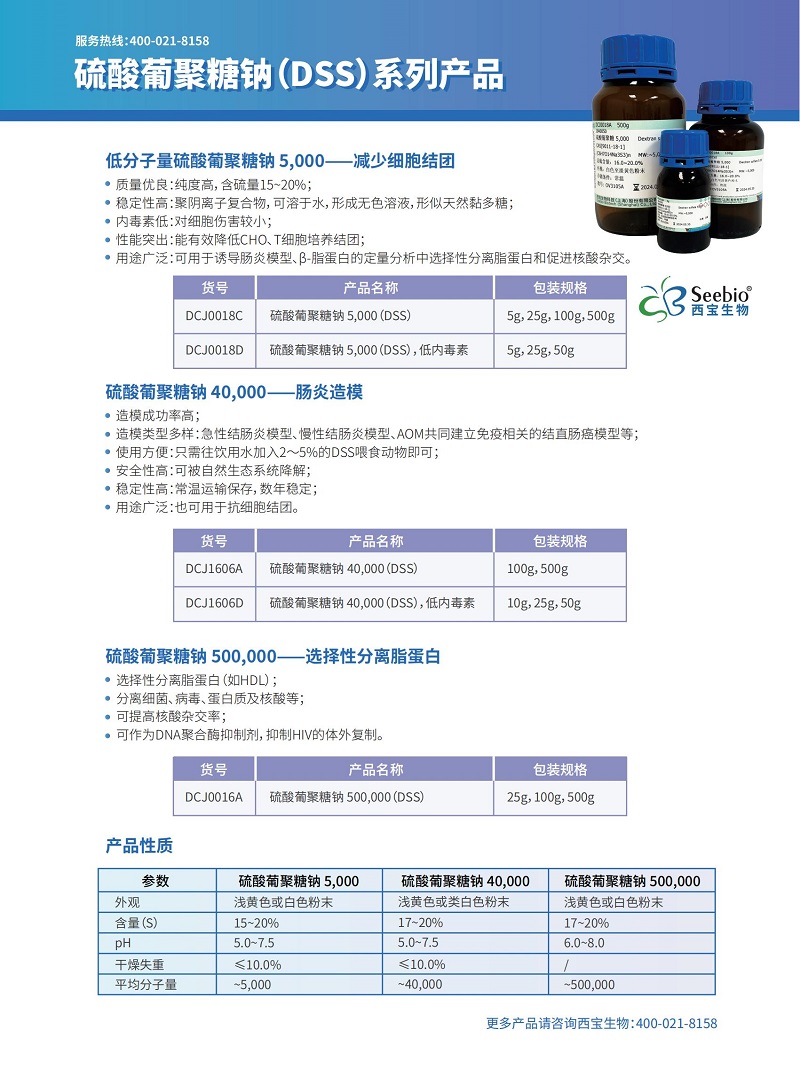 西寶生物可提供硫酸葡聚糖鈉(DSS)系列產(chǎn)品,產(chǎn)品請咨詢西寶生物:400-021-8158。