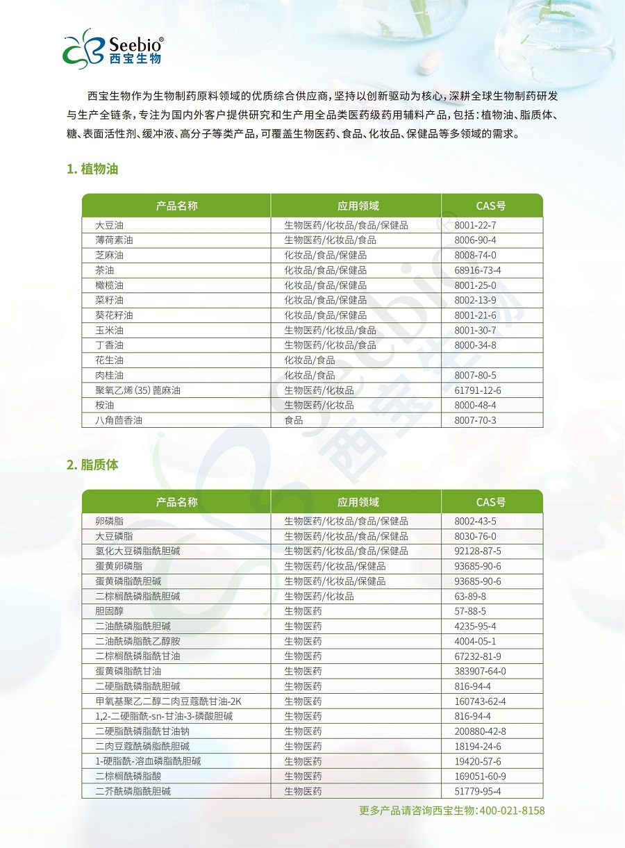 西寶生物作為生物制藥原料領(lǐng)域的優(yōu)質(zhì)綜合供應(yīng)商,堅(jiān)持以創(chuàng)新驅(qū)動(dòng)為核心,深耕全球生物制藥研發(fā)與生產(chǎn)全鏈條,專(zhuān)注為國(guó)內(nèi)外客戶(hù)提供研究和生產(chǎn)用全品類(lèi)醫(yī)藥級(jí)藥用輔料產(chǎn)品,包括:植物油、脂質(zhì)體、糖、表面活性劑、緩沖液、高分子等類(lèi)產(chǎn)品,可覆蓋生物醫(yī)藥、食品、化妝品、保健品等多領(lǐng)域的需求。