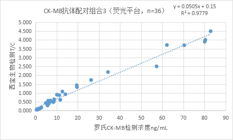 西寶生物熒光平臺(tái)CK-MB抗體配對(duì)組合3與羅氏CK-MB試劑(電化學(xué)發(fā)光法)賦值的的臨床樣本相關(guān)性R2>0.95,相關(guān)性良好;