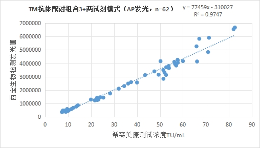 西寶生物發(fā)光(AE)平臺TM抗體配對組合2(三試劑模式)與希森美康 TM試劑(化學發(fā)光法)賦值的臨床樣本相關性R2>0.95,相關性良好。