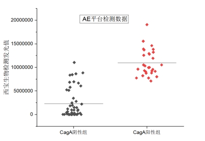 圖1為AE平臺(tái)檢測(cè)臨床樣本發(fā)光值分布,CagA陰性組發(fā)光值均值與CagA陽性組發(fā)光值均值能夠明顯區(qū)分。由表1數(shù)據(jù)可得,3例假陽性樣本及5例假陰樣本均落在參考系統(tǒng)的cutoff附近,屬于灰區(qū),需要用第三方試劑進(jìn)行確認(rèn)。西寶生物AE組合與參考系統(tǒng)的靈敏度大于80%,特異性及符合率大于90%,說明兩種試劑的臨床符合率較高。