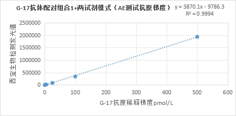 西寶生物發(fā)光(AE)平臺G-17抗體配對組合1(兩試劑模式)與亞輝龍G-17試劑(化學(xué)發(fā)光法)賦值的臨床樣本相關(guān)性R2>0.95,相關(guān)性良好;