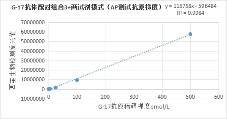 西寶生物熒光平臺G-17抗體配對組合5與亞輝龍G-17試劑(化學(xué)發(fā)光法)賦值的臨床樣本相關(guān)性R2>0.95,相關(guān)性良好;